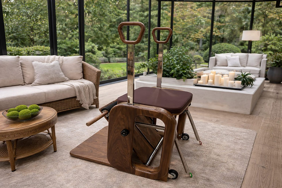 [ENG🇬🇧] Riva is a studio Pilates reformer for use in the studio and in the comfort of your home. Thanks to the selection of the highest quality wood for the production of this reformer, it is not only solid, but also beautiful and elegant, like a piece of furniture. The rich colors of the upholstery allow you to match it to any interior. Its high quality of workmanship and attention to detail make using Riva a pure pleasure. In addition, smooth operation, intuitive adjustment and ease of customization to your needs make it an excellent choice for anyone who wants to enjoy the benefits of Pilates at home.